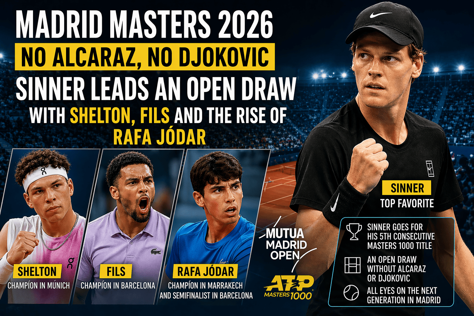 Madrid Masters 2026: without Alcaraz or Djokovic, Sinner leads an open draw with Shelton, Fils and the rise of Rafa Jódar