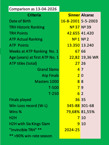 Sinner is back at the top of the ATP ranking and has also overtaken Alcaraz (No. 2) in the TRH, strengthening his position both in the present and in long-term historical projection.