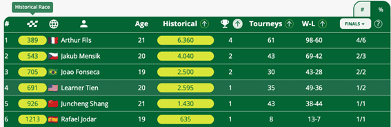 Dans le classement historique de la génération juste derrière Alcaraz, c’est-à-dire les joueurs nés après le 1er janvier 2004, c’est le Français Arthur Fils (Champion á Barcelona) qui sort du lot, devant Jakub Mensik, João Fonseca, Learner Tien et Juncheng Shang, qui suivent derrière.