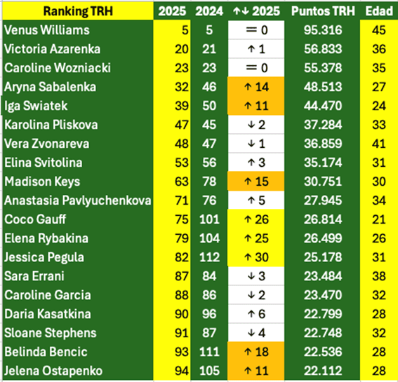 En conjunto, el Ranking TRH femenino en 2025 refleja una doble dinámica clara: consolidación histórica en la cima y construcción progresiva de legado en las zonas intermedias, con varias jugadoras aún en plena fase de crecimiento.