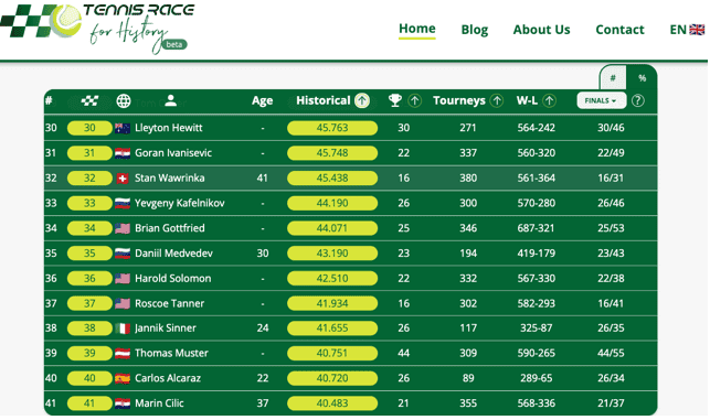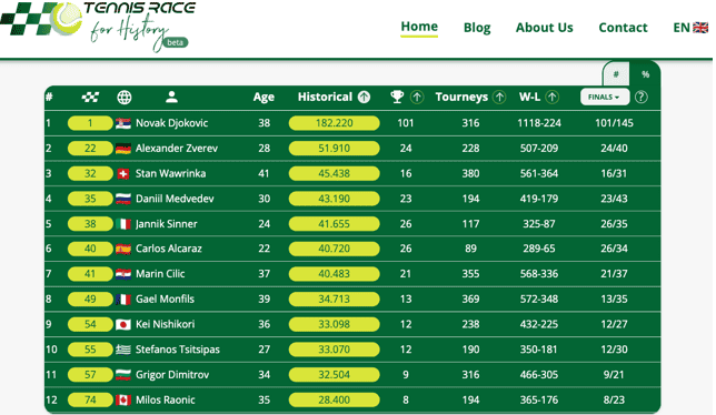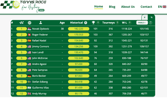 A continuación, presentamos la tabla histórica con los 12 mejores jugadores en activo según la Carrera del Tenis por la Historia (TRH):