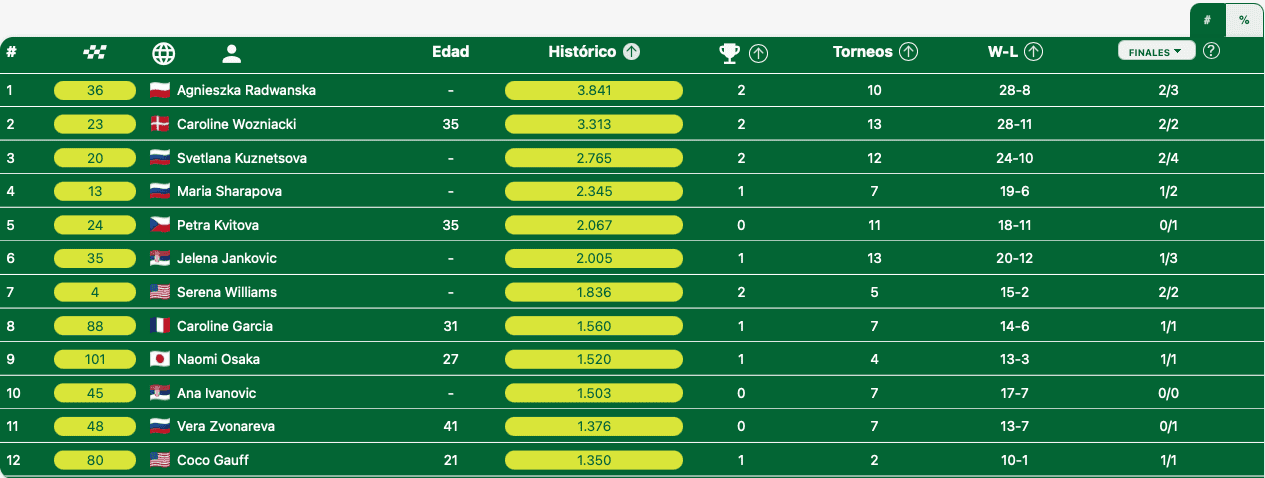 La lista femenina presenta una clasificación sin dominadoras. La lidera Agnieszka Radwanska con 2 títulos, los mismos que Caroline Wozniacki, Svetlana Kutnetsova y Serena Williams. En la presente edición, Iga Swiatek y Coco Gauff aspiran a unirse al club.