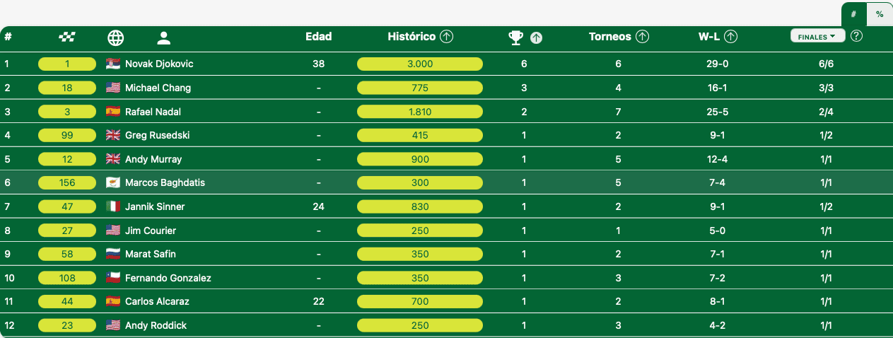 Siguen a gran distancia, Rafael Nadal, con 2 títulos, y Michael Chang, con menos puntos, pero con 3 trofeos.