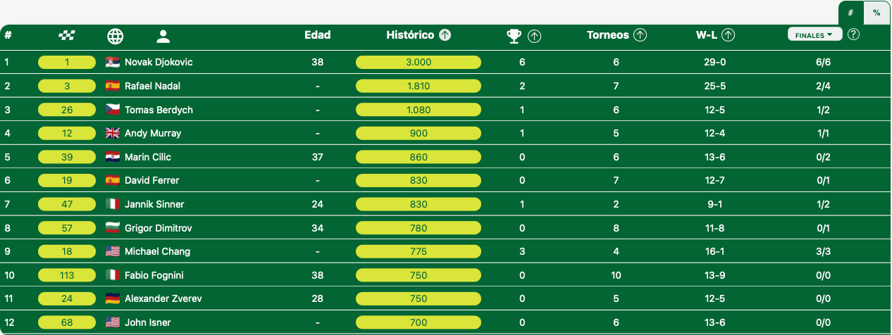 Djokovic domina sin rival en la categoría masculina. En féminas no hay dominadoras. En la categoría masculina, el dominio del serbio es apabullante. En sus seis participaciones ha sido campeón en todas, por tanto, sin haber cedido un solo partido de los 29 diputados.
