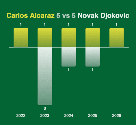 Alcaraz iguala a Novak Djokovic en el H2H. Aquí tenéis la distribución año a año. Para más detalles consultar arriba con los filtros.
